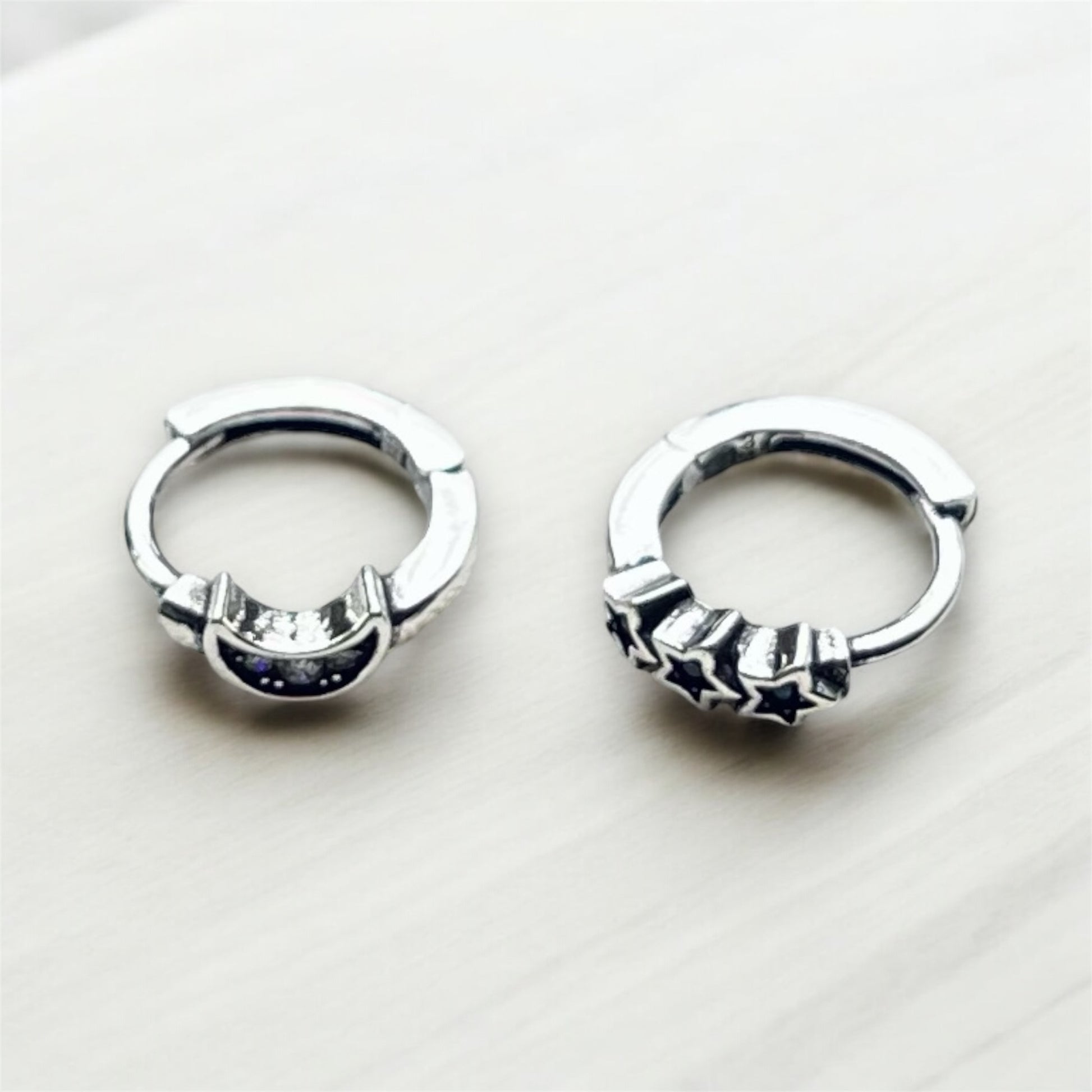 Dainty Moon and Stars Huggies. 925 Silver Silver Hoops with Diamond and Sapphire colour cubic zirconia Gem Stones Diameter 9mm