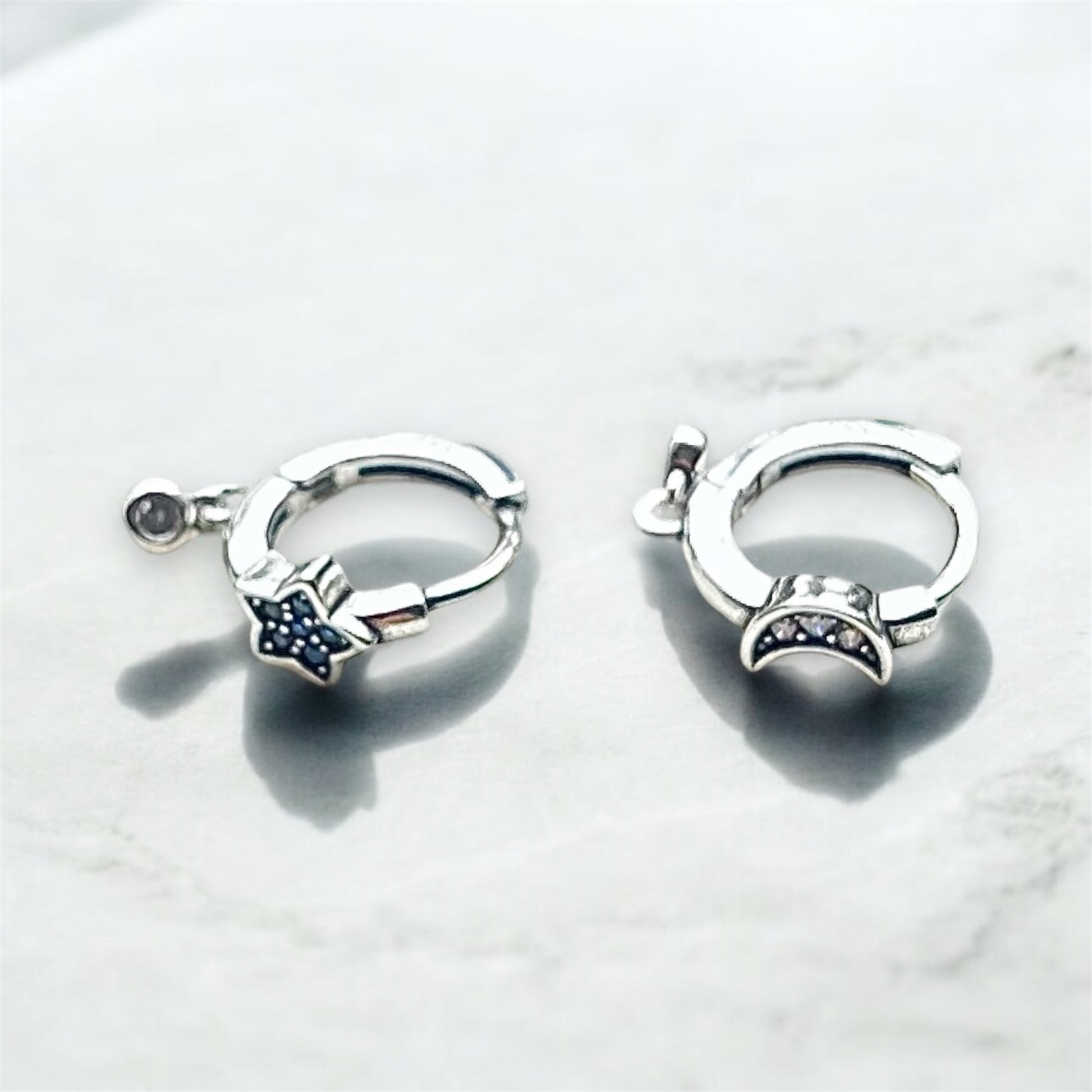 Dainty Moon and Star Huggies. 925 Silver Silver Hoops with Diamond and Sapphire colour Cubic Zirconia Gem Stone Diameter 9mm